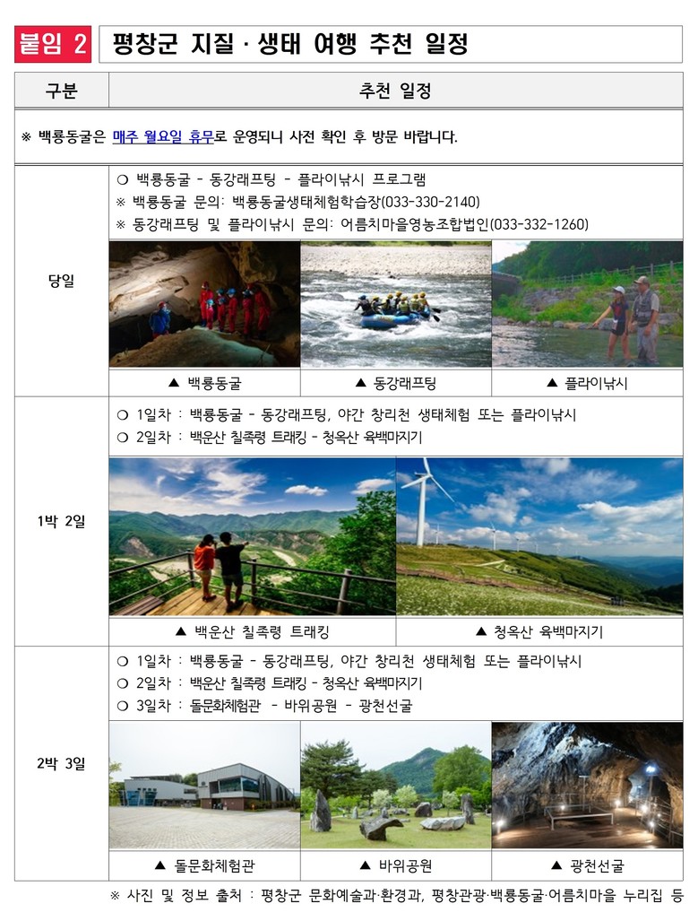 7월부터는 지역 전문가와 동행하여 평창~정선일대의 지질명소를 탐사하는 ‘강원고생대 지질공원 대탐사’와 평창 남부권역을 중심으로 한 ‘플래닛 평창’ 지질관광 프로그램이 본격적으로 시작된다. 아울러 어름치마을에서는 계절별 생태체험 프로그램이 연중 운영되어, 가족 단위 방문객에게 알찬 체험 여행지로 인기를 끌고 있다.