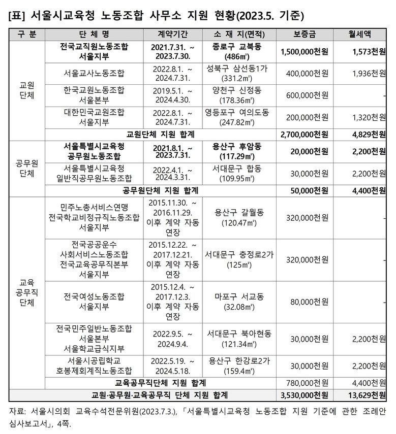 참고로 2023년 당시 서울시교육청은 전국교직원노동조합 서울지부에 보증금 15억원, 147평 규모의 사무소를 제공하면서 서울교육노조에는 보증금 2천만원, 35평 규모의 사무소를 제공하는 등 기준 없이 11개 노동조합에 사무소를 제공해 왔다.
