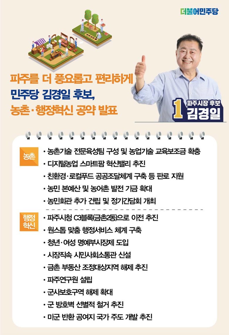 [세계타임즈 = 이영진 기자] 공식선거운동 마지막날인 31일, 더불어민주당 김경일 파주시장 후보는 행정혁신과 농촌 분야 공약을 발표했다. 행정 민원 처리에 어려움을 겪는 계층을 위한 원스톱 맞춤 행정서비스체계 구축이 눈에 띈다.