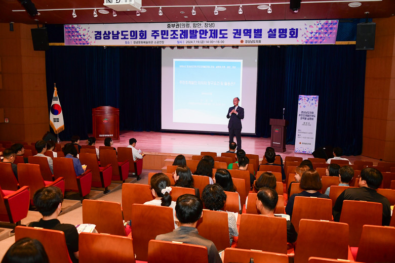 [경남 세계타임즈=최성룡 기자] 경상남도의회(의장 최학범)와 시군의회가 함께하는 ‘주민조례발안제도 5개 권역 설명회’ 중부권(의령, 함안, 창녕) 설명회가 7월 19일 창녕군 문화예술회관 소공연장에서 남부권, 북서부권에 이어 세 번째로 개최되었다.