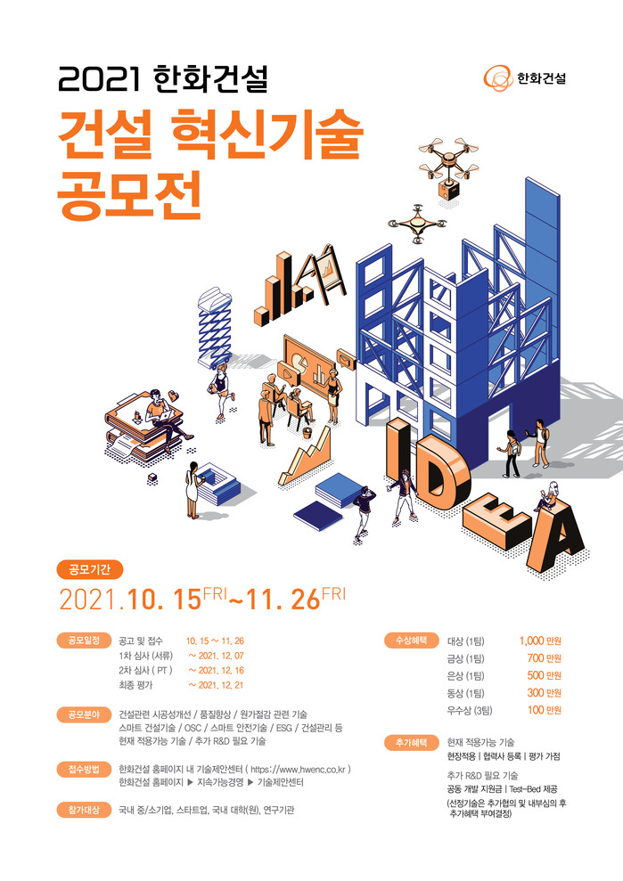 공모전 서류 접수는 10월 15일부터 11월 26일까지 진행되며 서류평가 및 PT평가를 통해 12월 21일 최종 수상작을 발표할 예정이다. 모집 대상은 국내 중소기업, 스타트업, 대학(원), 연구기관 등이며 한화건설 홈페이지내 기술제안센터 메뉴를 통해 접수 가능하다.