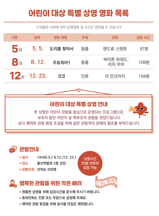 아울러 울산박물관은 기존 정기 상영과 함께 어린이 대상 특별 영화 상영 프로그램을 새롭게 마련했다. 어린이날과 여름·겨울방학 기간에 맞춰 가족 단위 관람객이 함께 즐길 수 있는 만화 영화를 선보인다.