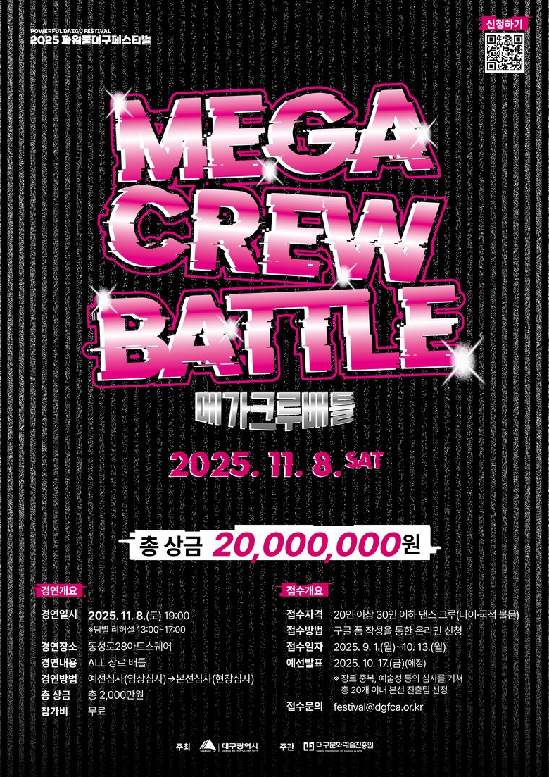 ▸ 동성로 28아트스퀘어에서 펼쳐질 메가크루의 ‘파워풀’ 스트릿댄스 배틀! [세계타임즈=대구 한윤석 기자] (재)대구문화예술진흥원은 지난 5월 성료한 2025 파워풀대구페스티벌의 후속 프로그램으로 ‘메가크루배틀’에 참가할 크루를 9월 1일부터 10월 13일까지 모집한다.
