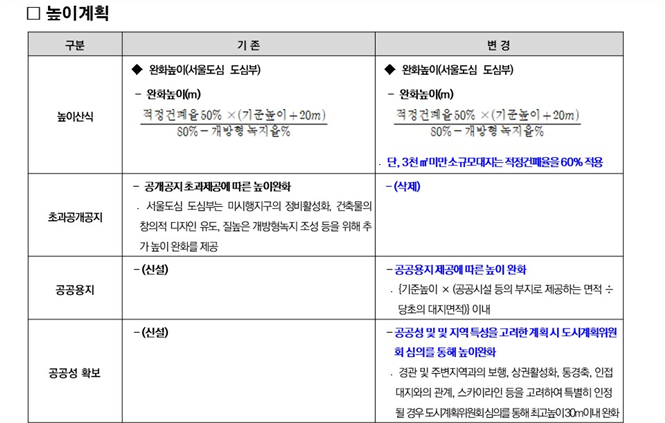 공개공지 초과 제공에 따른 높이 완화 항목을 삭제하는 대신 공공용지제공 시 높이 완화를 추가하였으며, 계획의 공공성 또는 지역별 특성을 고려하여 도시계획위원회 심의를 통해 높이를 추가 조정할 수 있도록 하였다.