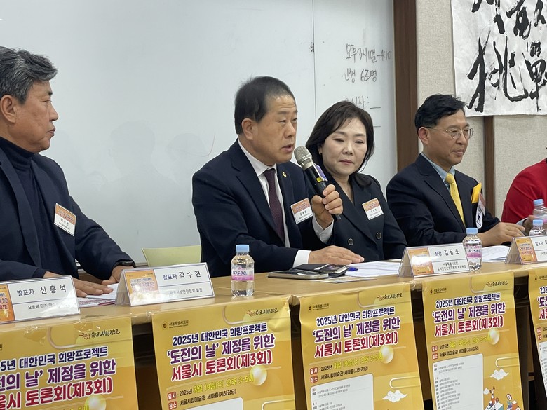 ▲ 지난 3월 19일 서울시립미술관 세마홀에서 개최한 ‘2025년 대한민국 희망프로젝트 도전의 날 제정을 위한 서울시 토론회(제3회)’에서 김용호 시의원(왼쪽 두 번째)이 좌장을 맡아 토론을 진행하고 있다. |