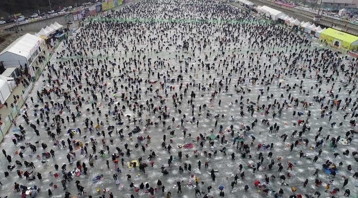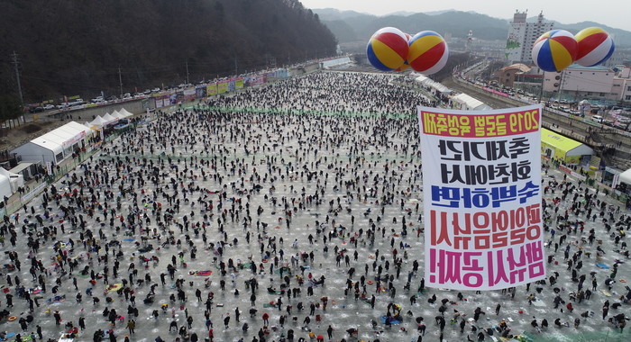 [화천군=세계타임즈 김민석 기자] 2019 화천산천어축제장이 12일 주말을 맞아 발디딜틈없이 관광객들로 성황을 이루고 있다.