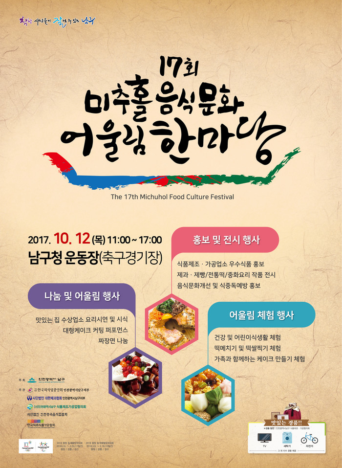 남구는 오는 10월12일 오전 11시부터 구청 운동장에서 ‘제17회 미추홀 음식문화 어울림 한마당’을 개최한다.