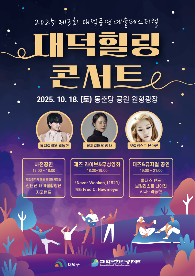 최충규 대덕문화관광재단 이사장은 “대덕힐링콘서트는 야외에서 문화예술을 함께 누리는 구민 소통의 장”이라며 “가족, 친구와 함께 방문해 편안하게 쉬고 즐기는 시간을 보내시길 바란다”고 말했다.