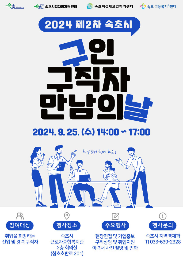 - 속초시, 고용시장 활성화와 일자리 창출 위해 행정력 집중 - [속초시 세계타임즈=김민석 기자] 속초시는 오는 9월 25일 속초시 근로자종합복지관 2층 회의실에서 「2024년 제2차 속초시 구인·구직자 만남의 날」 행사를 개최한다.