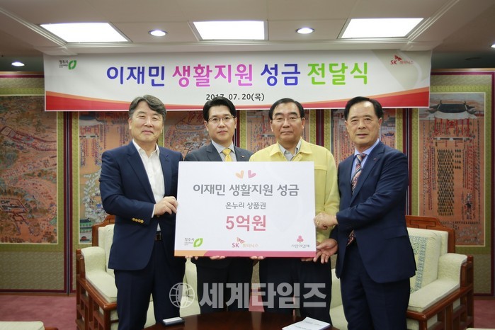 이날 성금 기탁식에는 이승훈 청주시장, 이민성 충북사회복지공동모금회 부회장, 박영진 전국재해구호협회 사무총장, 이일우 SK하이닉스 청주경영지원실장이 참석했다.