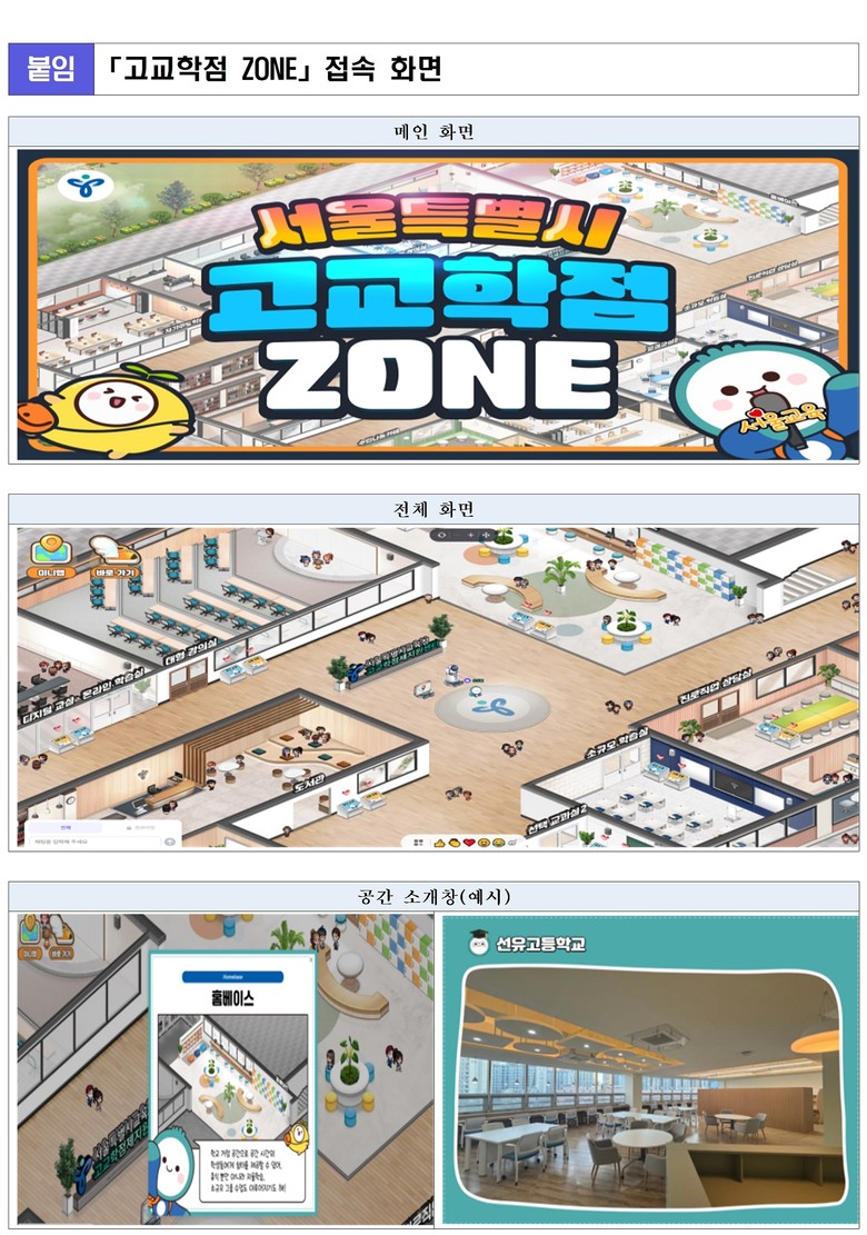 이번에 개통되는 「고교학점 ZONE」은 △학점제형 공간 조성의 원리 안내, △고교학점제 교육과정 운영에 필요한 학교 공간 소개, △공간 조성 실제 사례 소개로 구성되어 있다. 가상공간 플랫폼(ZEP)에서 참여자는 서울시교육청 대표 캐릭터인 ‘자라나’를 이동하면서 고교학점제 핵심 공간이 담긴 가상학교를 탐방할 수 있다.