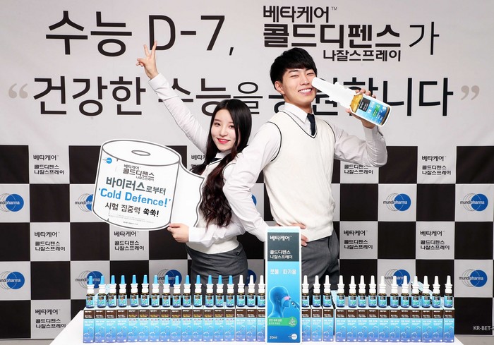 한국먼디파마 베타케어™ 콜드디펜스 나잘스프레이 및 베타딘® 인후스프레이 마케팅 담당 김광준 대리는 “2018학년도 대학수학능력시험이 일주일 뒤인데, 수험생들이 지금까지 공부한 실력을 모두 발휘하기 위해서는 당일 시험 컨디션이 중요하다”며 “중요한 시기에 호흡기 감염에 걸리면 시험에 집중하기가 힘들 수 있으므로 수능을 준비하면서 건강도 함께 챙겨야 한다”고 말했다.