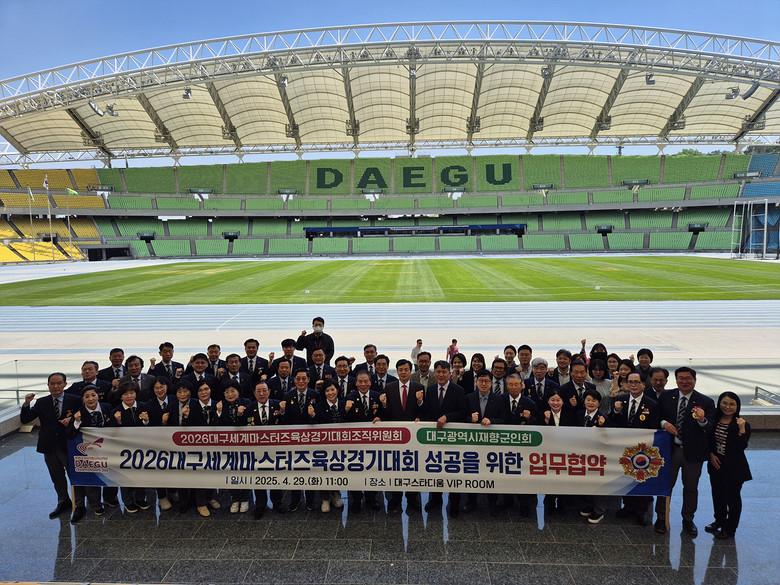 ▸ 전 세계 90개국 1만 1천여 명이 참가하는 대규모 국제 스포츠축제 준비 박차 [세계타임즈=대구 한윤석 기자] 2026대구세계마스터즈육상경기대회(WMAC Daegu 2026)의 성공 개최를 위해 대회 조직위원회는 재향군인회와 협력체계를 구축했다.