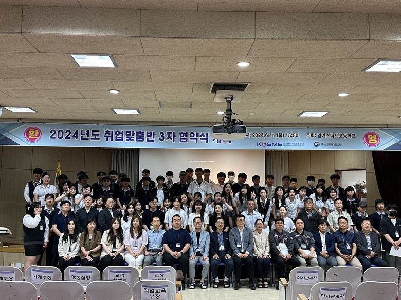 [시흥시 세계타임즈=송민수 기자] 경기스마트고등학교(교장 이선길)는 6월 11일 중소기업 우수 인력 양성을 위한 취업맞춤반 3자 협약식을 진행하였다. 이날 협약식에는 ㈜덕영테크 외 25개의 기업대표와 임직원, 학부모, 학생들이 참석하였다.