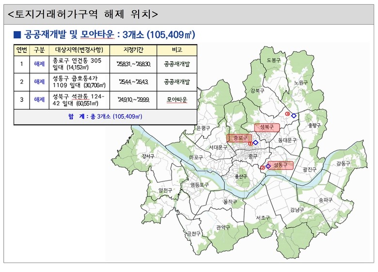 한편, 공공재개발 후보지 취소 및 모아타운 대상지 철회 지역 3곳은 지정사유, 투기 사유가 해소됨에 따라 토지거래허가구역을 해제한다.