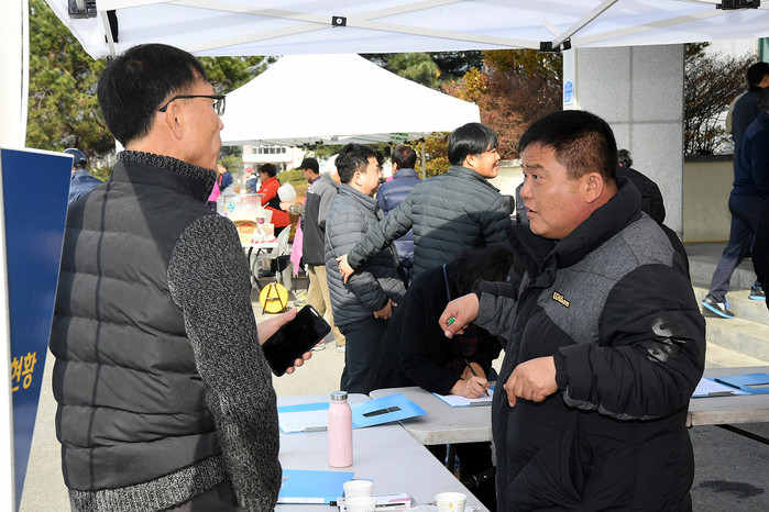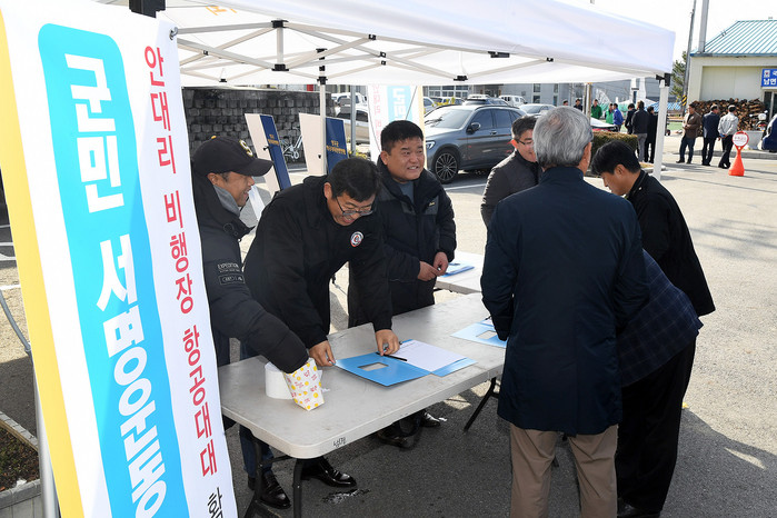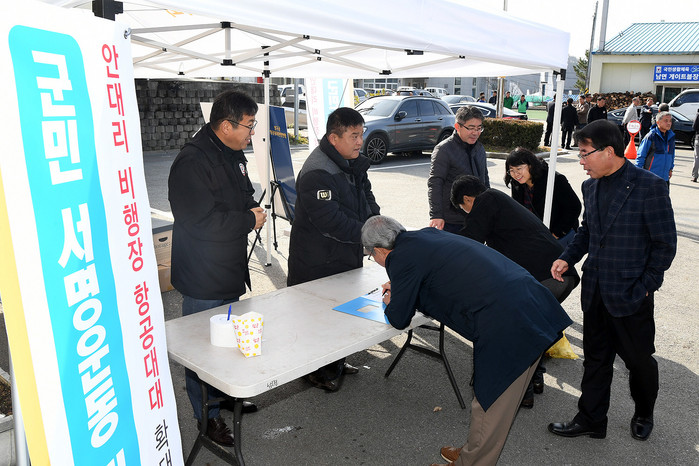 [양구군=세계타임즈 김민석 기자] 김철 안대리비행장항공대대확대반대특별위원회위원장과 의회사무과 직원들이 15일 용하체육관 입구에서 안대리 비행장 항공대대 확대를 반대하는 군민 서명운동을 전개했다.