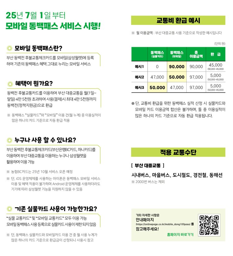 박형준 시장은 “'동백패스'가 시행 2년 만에 가입자 70만 명을 돌파하며 부산을 대표하는 대중교통 활성화 정책으로 자리매김했다”라며, “오는 7월 「모바일 동백패스」 시행으로 이용 편의성이 향상돼 더 많은 시민이 동백패스 혜택을 누릴 것으로 기대한다. 앞으로도 모빌리티 혁신을 바탕으로 시민 불편을 해소하며 누구나 언제 어디서든 편리하게 대중교통을 이용할 수 있는 부산을 만들기 위해 최선을 다하겠다”라고 전했다.