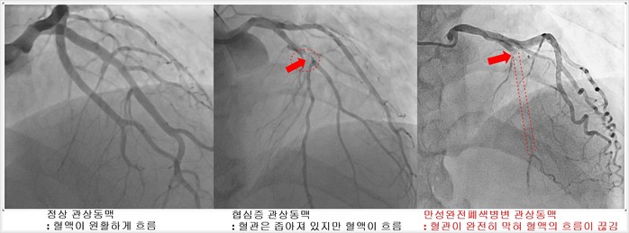 | ▲1. 정상 관상동맥 - 혈액이 원활하게 흐름 2. 협심증 관상동맥 – 혈관은 좁아져 있지만 혈액이 흐름 3. 만성완전폐색병변 관상동맥 – 혈관이 완전히 막혀 혈액의 흐름이 끊김 <이미지 서울아산병원 제공> |