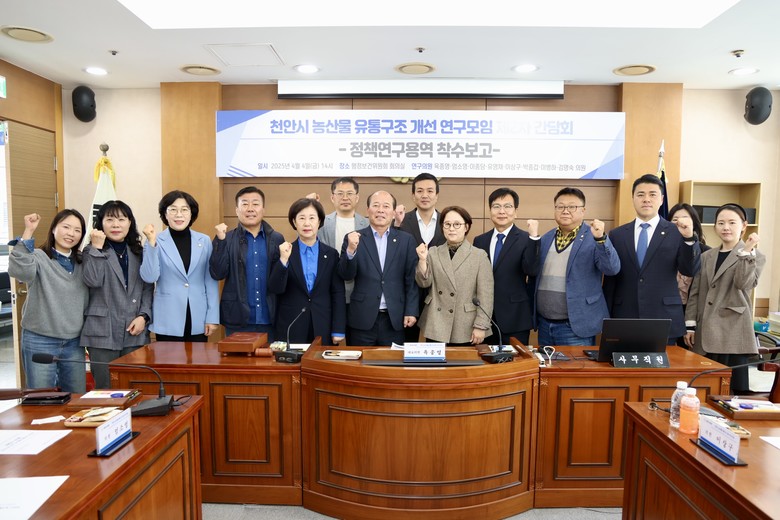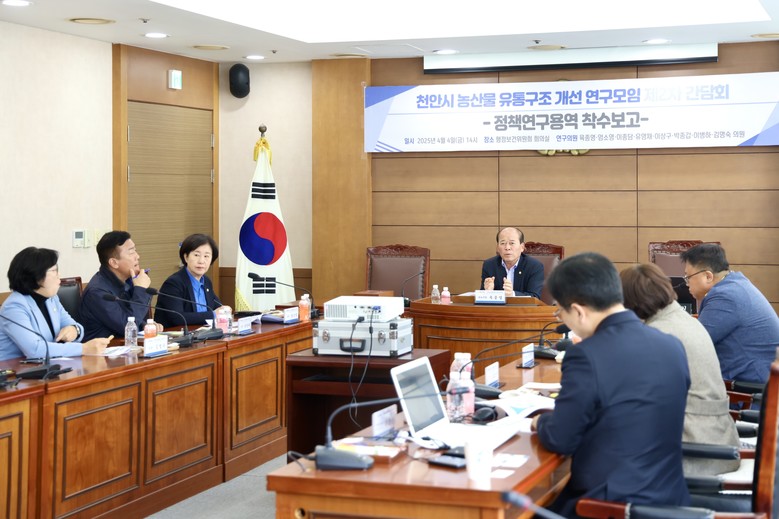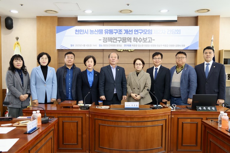 [천안시 세계타임즈=이현진 기자] 천안시의회(의장 김행금)는 의원 연구모임인 <천안시 농산물 유통구조 개선 연구모임>(대표의원 육종영)이 4월 4일 제2차 간담회를 열고 정책연구 과제를 구체화했다고 밝혔다.