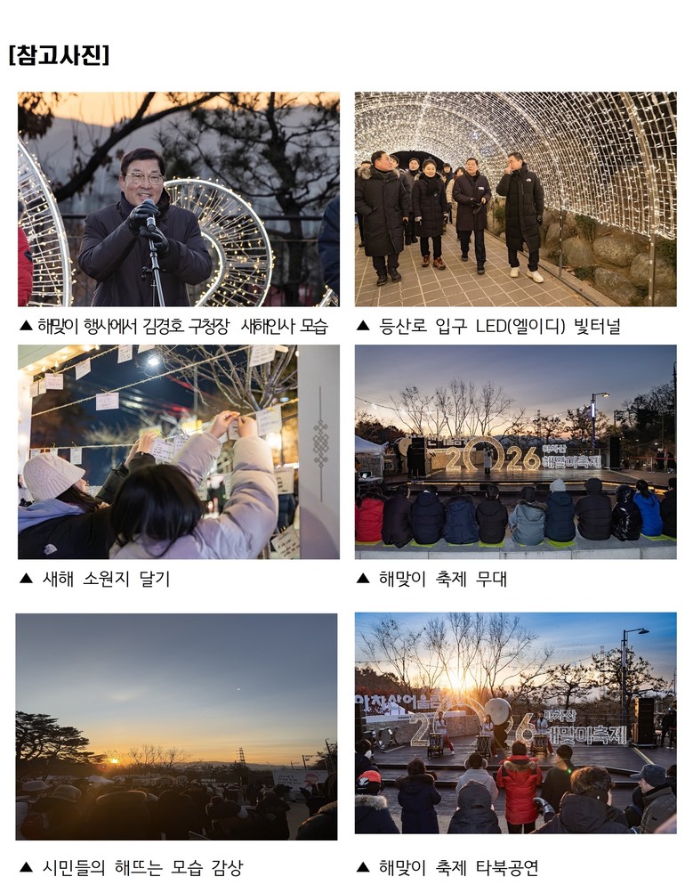 김경호 광진구청장은 “아차산의 첫 일출이 병오년을 힘차게 여는 출발점이 되길 바란다”면서 “구민 모두가 건강하고 활력 넘치는 한 해를 보내시길 기원한다”고 말했다.