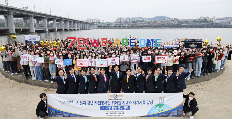 [세계타임즈 백진욱 기자] 한국의 청년 자원봉사단 ‘위아원'(We Are One) 자원봉사단원들이 24시간 내 가장 많은 헌혈자 등록으로 기네스 세계기록에 등재됐다. 지난 1일 기네스 세계 기록 도전을 위해 '위아원'은 24시간 동안 7만 1천121명의 자원봉사자가 온라인 헌혈 신청을 마쳤다.