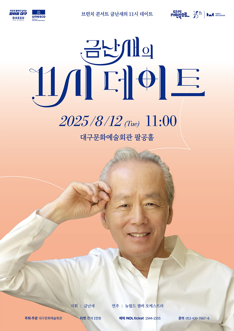 ▸ 클래식 명곡부터 영화음악까지, 다채로운 프로그램으로 음악 속 여유와 힐링 선사 [세계타임즈=대구 한윤석 기자] 대구문화예술회관은 오는 8월 12일(화) 오전 11시, 팔공홀에서 기획공연 ‘금난새의 11시 데이트 – 8월’을 선보인다.