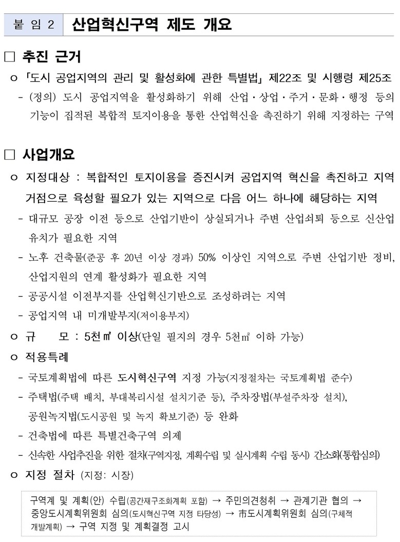 산업혁신구역은 대규모 공장 및 공공시설 이전부지, 공업지역 내 미개발부지 등을 대상으로 산업·주거·문화 기능이 융합된 복합 거점 공간을 조성하는 공업지역 정비 제도이다.