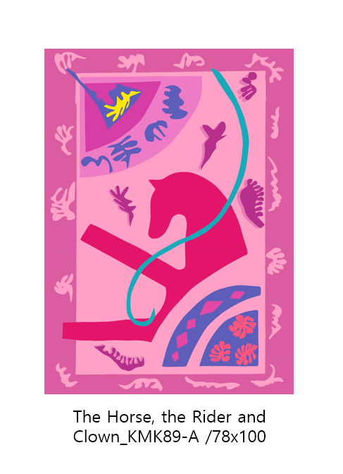 김민경 작가는 앙리 마티스가 1947년 이후의 행복을 주제로 한 생생하고 강렬한 색채로 된 컷아웃 기법의 작품을 재해석한 오마쥬 작품들을 선보이고 있다.