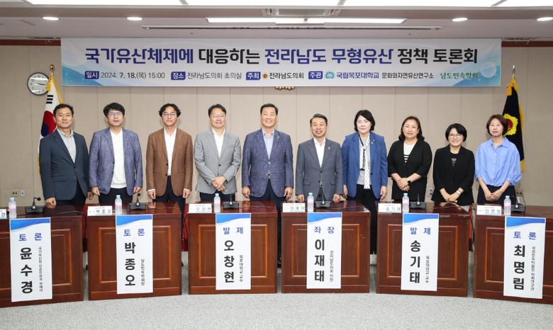 [전남 세계타임즈=우덕현 기자] 전라남도의회 이재태 의원(더불어민주당ㆍ나주3)이 좌장을 맡은 ‘전라남도 무형유산 정책 토론회’가 지난 7월 18일(화) 전라남도의회 초의실에서 개최됐다.