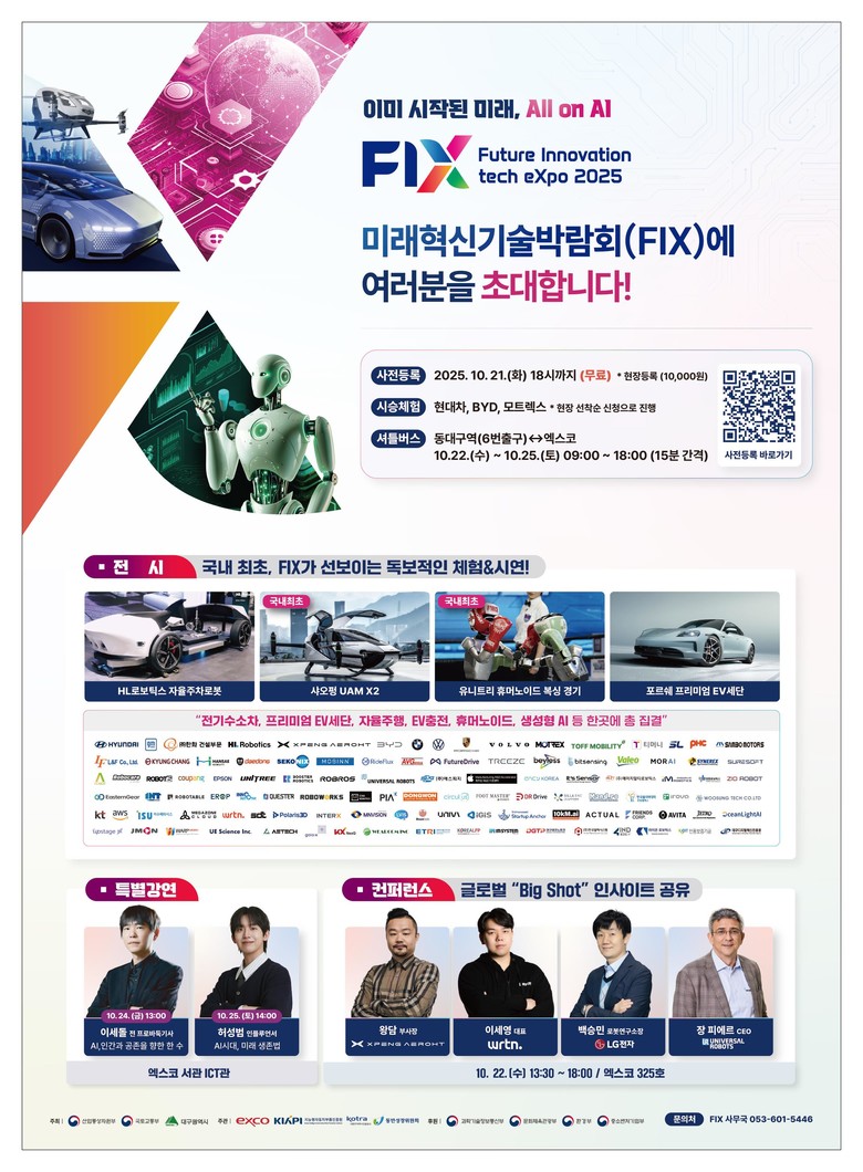 대구시는 ‘지역거점 AX 혁신 기술개발사업’ 예타면제 의결을 계기로 모빌리티·로봇 등 지역 주력산업의 AX 전환에 속도를 높여가고 있다. 이에 FIX 2025가 새 정부의 미래산업 정책에 부응하는 지역 의지를 천명하는 뜻깊은 자리가 될 수 있도록, 각 전시관별로 지역기관 및 기업과 협력하는 공동관을 조성해 ‘AI 로봇수도’, ‘AX 연구개발 허브’로서 다시 뛰는 대구의 비전을 담아낼 계획이다.