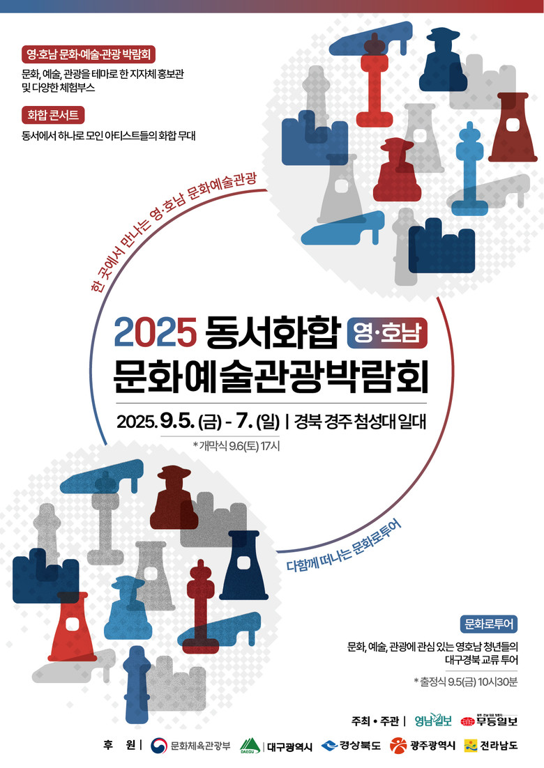 ▸ 대구‧경북 ‘문화로투어’ 통해 영호남 청년 상호 이해 높여 [세계타임즈=대구 한윤석 기자] 대구광역시는 경상북도, 광주시, 전라남도와 함께 오는 9월 5일(금)부터 7일(일)까지, 경주 첨성대 일원에서 ‘2025 동서화합 영호남 문화예술관광 박람회’를 개최한다. 같은 기간, 영호남 청년들이 함께 지역을 탐방하며 우의를 다지는 ‘문화로투어’도 진행된다.