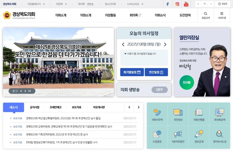 [경북 세계타임즈=한성국 기자] 경상북도의회(의장 배한철)는 제12대 도의회 출범과 함께 도민과의 소통을 강화하고 의정소식을 효과적으로 제공하기 위해 새롭게 개편된 홈페이지(council.gb.go.kr)를 8월 9일부터 운영한다고 밝혔다.