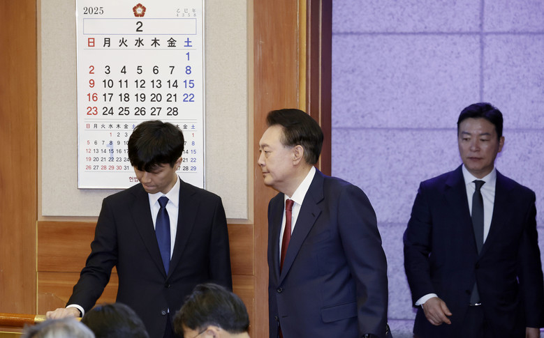 [세계타임즈 = 조윤수 기자] 윤석열 대통령이 4일 서울 종로구 헌법재판소에서 열린 탄핵심판 5차 변론기일에 출석하고 있다. 2025.2.4 [사진공동취재단]