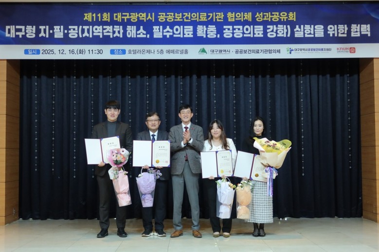 이번 성과공유회에서는 지역 공공의료 발전에 기여한 유공자 4명에게 대구광역시장상이 수여됐다. 수상자는 ▲칠곡경북대학교병원 임봉선 간호사 ▲대구의료원 이혜숙 간호사 ▲대구보훈병원 김형우 경영기획과장 ▲율하경대연합정형외과의원 노재수 원장이다.