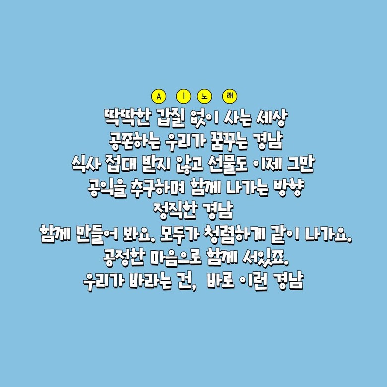 엠제트(MZ)세대를 위한 맞춤형 청렴 콘텐츠도 개발된다. 경남도는 인공지능(AI) 기술을 활용해 ‘3無(무) 업고 3行(행) 청렴송’을 자체 제작했다. 이 청렴송은 젊은 세대의 감성에 맞춰 쉽고 재미있게 청렴 메시지를 전달하기 위해 기획됐으며, 누구나 부담 없이 따라 부를 수 있도록 제작됐다.