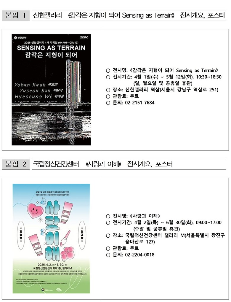 보건복지부 국립정신건강센터 갤러리 M에서는 서울장애예술창작센터 입주작가 2인을 초청하여 《사랑과 이해》(4.2.~6.30.) 전시를 개최한다. 4월 2일 세계 자폐증 인식의 날을 기념해 '사랑(4)과 이해(2)'로 우리 '사이(42)'를 잇는다는 메시지를 담았다. 독특한 관점으로 현실과 상상의 경계를 오가는 두 작가의 작업은 관람객이 나와 타인이 지각하는 세계의 차이를 자연스럽게 이해하도록 이끈다.