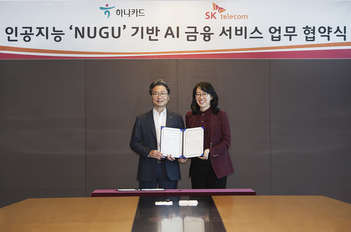 | ▲ SK텔레콤은 을지로 T타워에서 하나카드와 오픈플랫폼을 기반으로 한 서비스 개발을 진행하기로 MoU를 체결했다고 15일 밝혔다. 이에 따라 SK텔레콤은 ‘19년 상반기 중 AI ‘누구’를 통해 음성으로 하나카드 혜택 조회, 인근 카드 영업점 조회 등 카드 관련 정보를 제공할 예정이다. 하나카드 정성민 디지털사업본부장(좌)-SK텔레콤 박명순 AI사업 유닛장(우) |