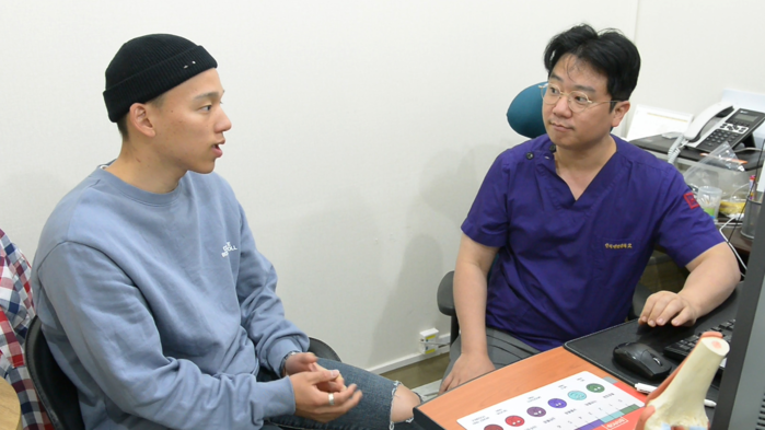 | ▲시술전 진료를 받고 있는 이지훈 선수(사진 왼쪽) |