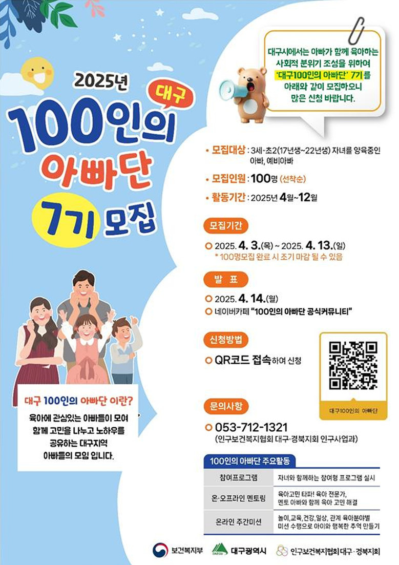 · 문의처 : 대구 100인의 아빠단 운영진(☎053-712-1321/인구보건복지협회 대구경북지회)