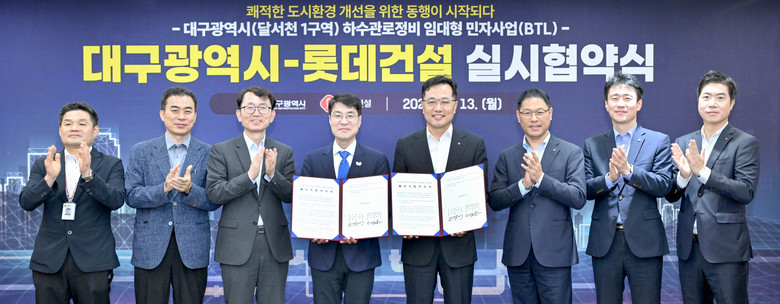 ▸ 2032년까지 ‘재정사업’과 함께 2조 6천억 투입… 분류화율 80% 목표 [세계타임즈=대구 한윤석 기자] 대구광역시는 금호강 르네상스 핵심사업인 ‘하수관로 우·오수 분류화 사업’의 신속한 추진을 위해, 10월 13일(월) 오후 2시 동인청사 2층 상황실에서 ‘달서천 1구역 하수관로정비 임대형 민간투자사업(BTL)’의 실시협약을 롯데건설과 체결했다.