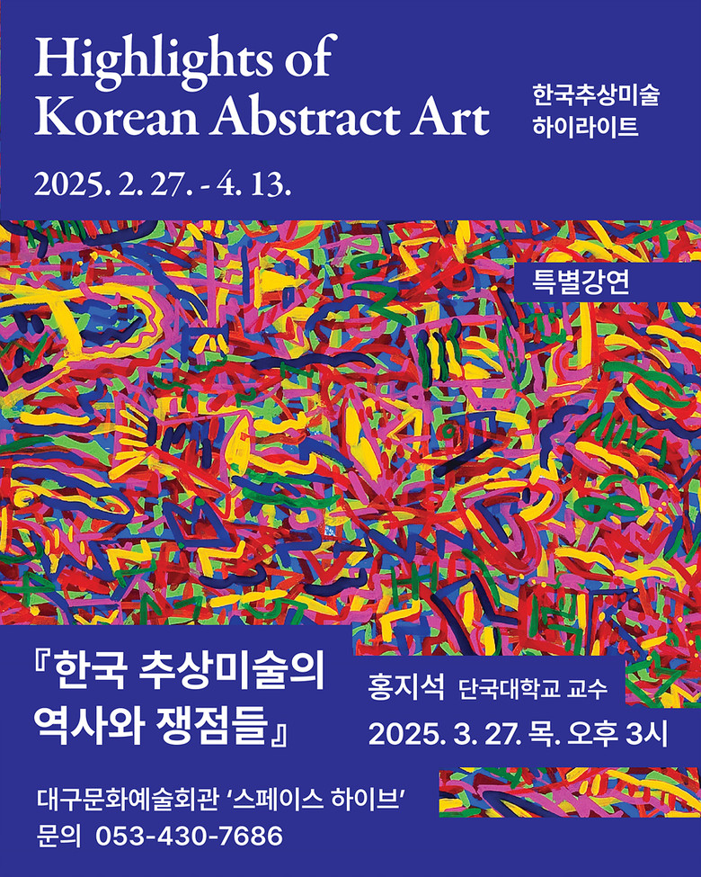 ▸ 3월 27일(목) 오후 3시 대구문화예술회관 스페이스 하이브 [세계타임즈=대구 한윤석 기자] 대구문화예술회관(관장 김희철)은 《한국추상미술 하이라이트》 전시 연계 프로그램으로 <한국추상미술의 역사와 쟁점들>을 주제로 한 홍지석 단국대학교 교수의 특별강연을 3월 27일(목) 오후 3시 대구문화예술회관 스페이스 하이브에서 개최한다.