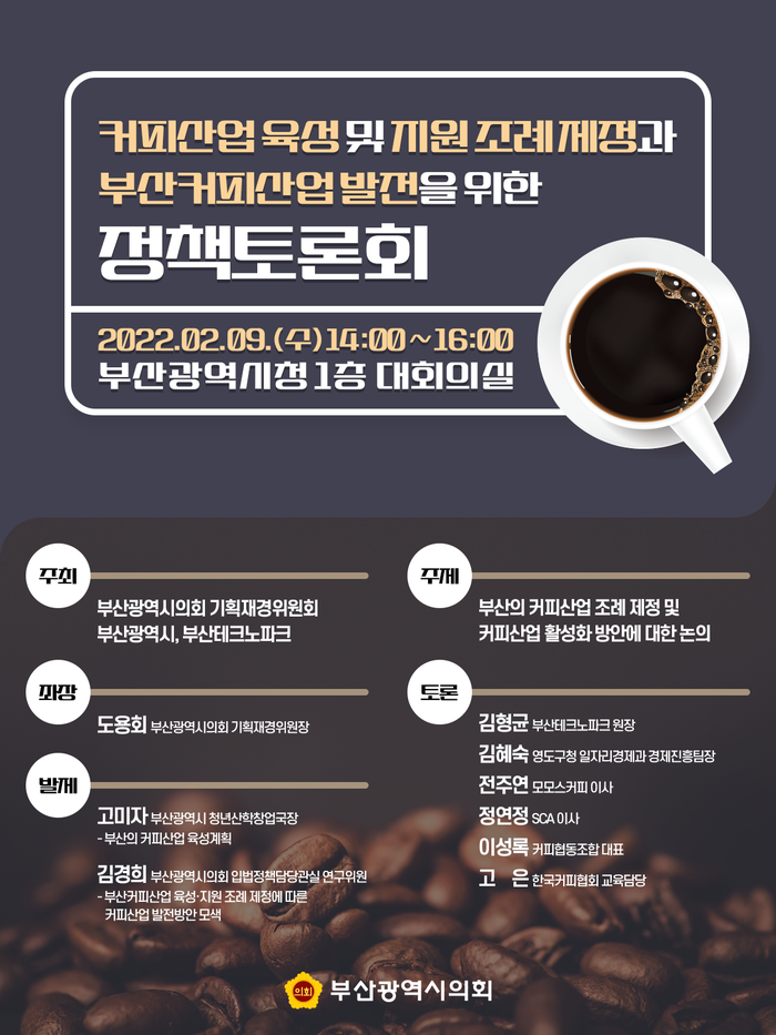 부산시의회 도용회 기획재경위원장이 좌장을 맡고, 발제자로 부산시 고미자 청년산학창업국장과 부산시의회 입법정책담당관실 김경희 연구위원이 각각 ‘부산의 커피산업 육성계획’과 ‘커피산업 육성·지원 조례 제정에 따른 커피산업 발전방안 모색’을 주제로 발제한다.