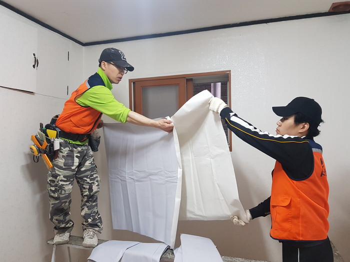 주말에도 오전 8시부터 방치석 도배회장을 비롯해서 김경미 김미옥 박인옥 서선영 소명화 이준우 이해숙 회원들이 곰팡이가 심한 벽지 교체 및 집안청소 봉사를 하였다.