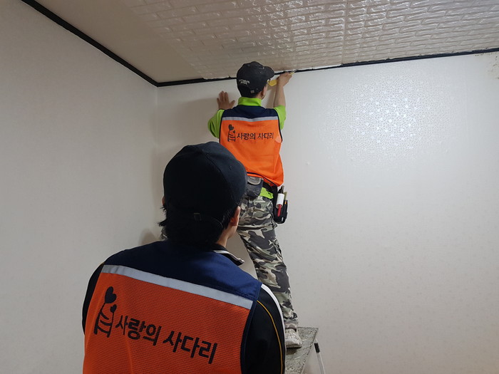 중국 다문화가정 왕규민 회원은 “오랫동안 곰팡이 냄새로 고생했는데, 오늘 사랑의 사다리 밴드에서 곰팡이가 심한 벽지를 교체해 주어서 진심으로 감사드린다.“고 말했다.