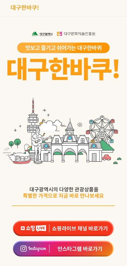 올해로 5회째를 맞은 본사업은 숙박·체험·유원시설·대구10味(미) 등 다양한 지역 관광상품을 온라인 플랫폼을 통해 판매·홍보해 지역 관광업체의 매출 증대와 관광 활성화를 도모했다.