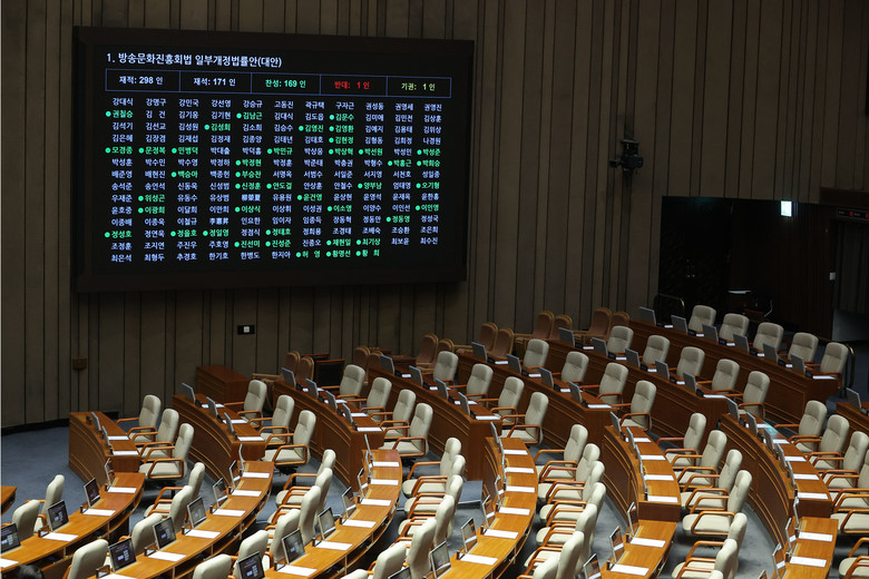 21일 국회 본회의에서 방송문화진흥회법 일부개정법률안이 통과되고 있다. 2025.8.21