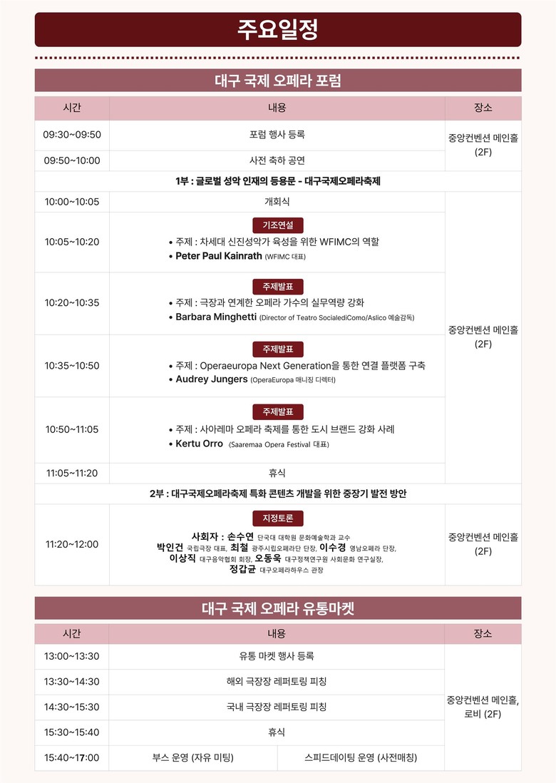오후 1시부터 진행되는 ‘대구 국제 오페라 유통 마켓’은 국내외 오페라 극장와 제작단체, 프로듀서, 예술경영기관 관계자들이 참여하는 B2B 오페라 산업 교류의 핵심 섹션이다. ▲해외 극장장 레퍼토리 피칭, ▲국내 극장장 레퍼토리 피칭, ▲부스운영(20개소), ▲스피드 데이팅(1:1 미팅) 프로그램이 함께 진행된다.