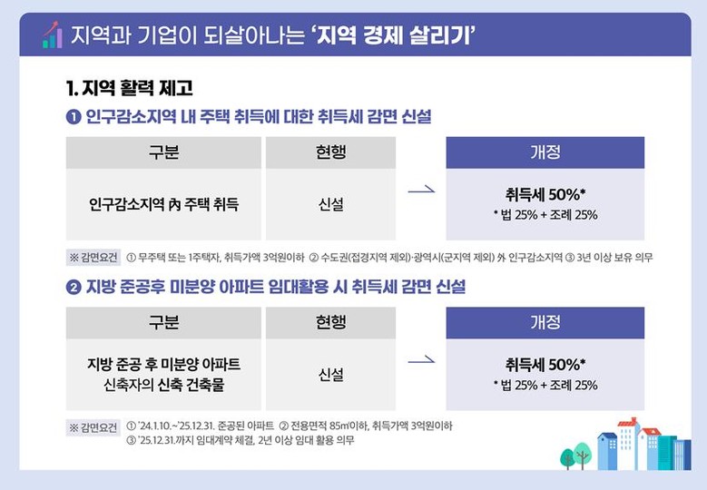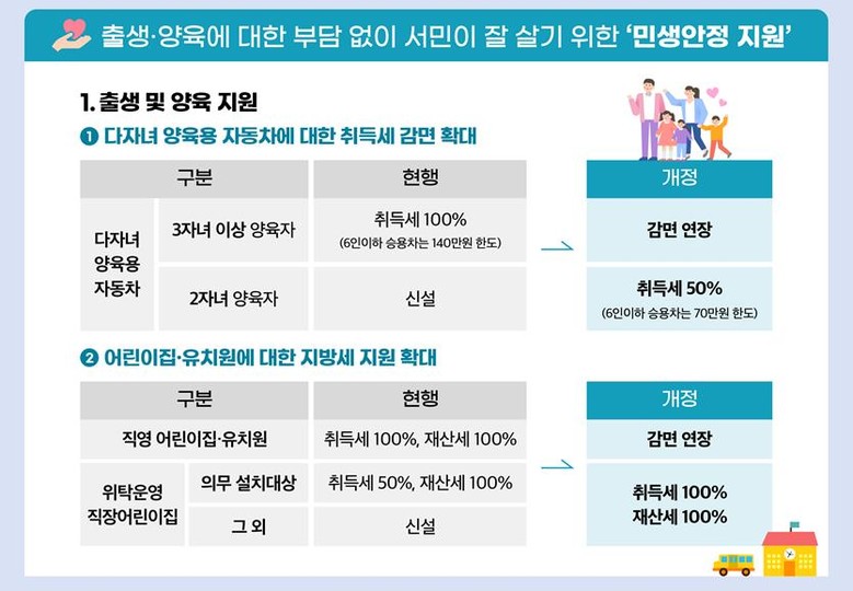 먼저 가정경제 부담을 줄이고자 다자녀 양육자가 구매하는 자동차의 취득세 감면 기준을 현행 세자녀 이상에서 두자녀까지 확대한다.세자녀 이상 가정의 취득세 100%(6인 이하 승용차는 140만원 한도) 감면은 연장하고, 두자녀 양육자에 대해서는 취득세 50%(6인 이하 승용차는 70만원 한도) 감면을 신설하는 방식이다.행안부는 이번 조치로 세 자녀 가정에 508억원, 두 자녀 가정에 1천286억원 등 총 1천794억원의 자동차 취득세가 감면될 것으로 기대했다.이는 법 개정에 따른 총 예상 감면액 2천700억원의 66%다.아울러 직영 어린이집·유치원에 대한 취득세·재산세 100% 감면을 연장하고, 위탁운영 직장 어린이집에 대한 취득세·재산세 감면을 100%로 확대한다.다음으로 인구감소지역의 경제 활성화 등을 위해 인구감소지역 내 주택(요건 충족 시)에 대한 취득세와 수도권 외 지역에서 준공 후 미분양된 아파트를 임대주택으로 활용할 시 신축 취득세를 최대 50% 감면한다.이번 방안으로는 총 714억원 정도의 감면 효과가 있을 것으로 행안부는 추정했다.