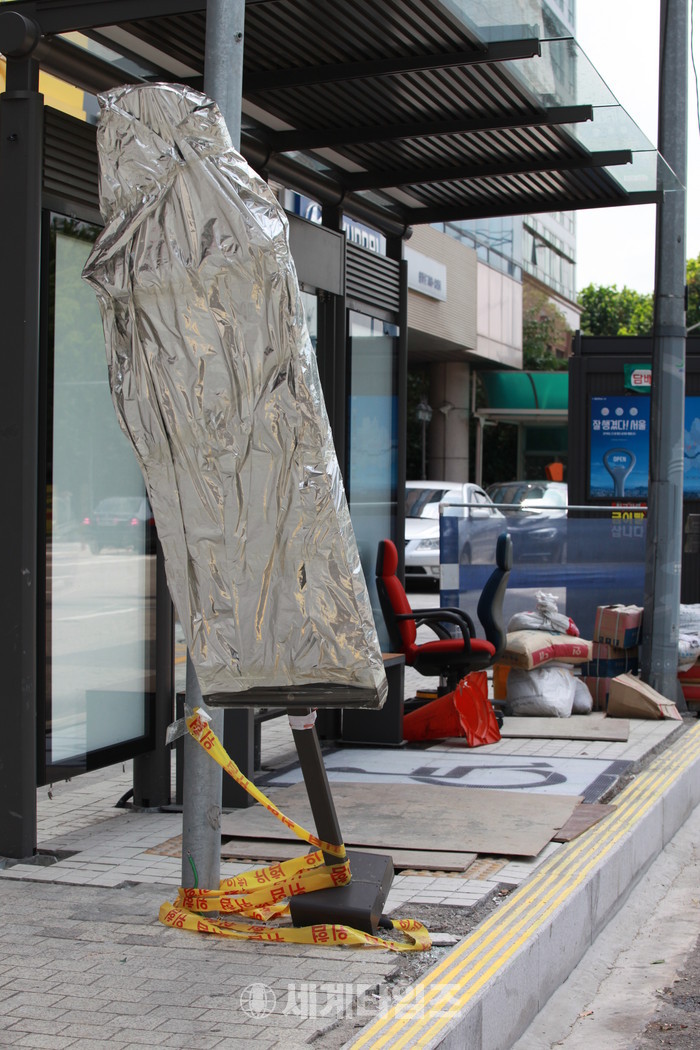 [세계타임즈 윤일권 기자]정류장 설치공사가 중단된지2개월동안 방치.정류장이 아니고 쓰레기 버리는 장소가 되었다.