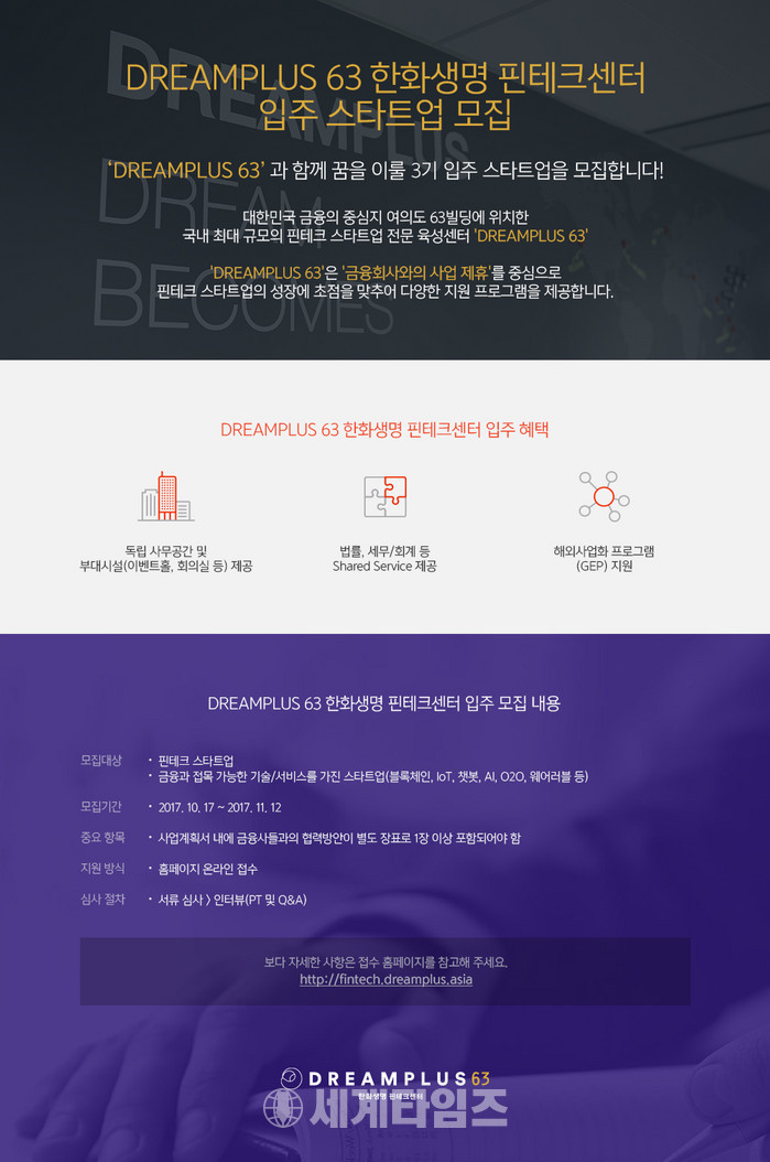 [세계타임즈 이채봉 기자] 대한민국 핀테크 스타트업 생태계의 허브로 자리매김한 한화생명 드림플러스 63 핀테크센터가 3기 입주사를 공개모집한다고 17일(화) 밝혔다.
